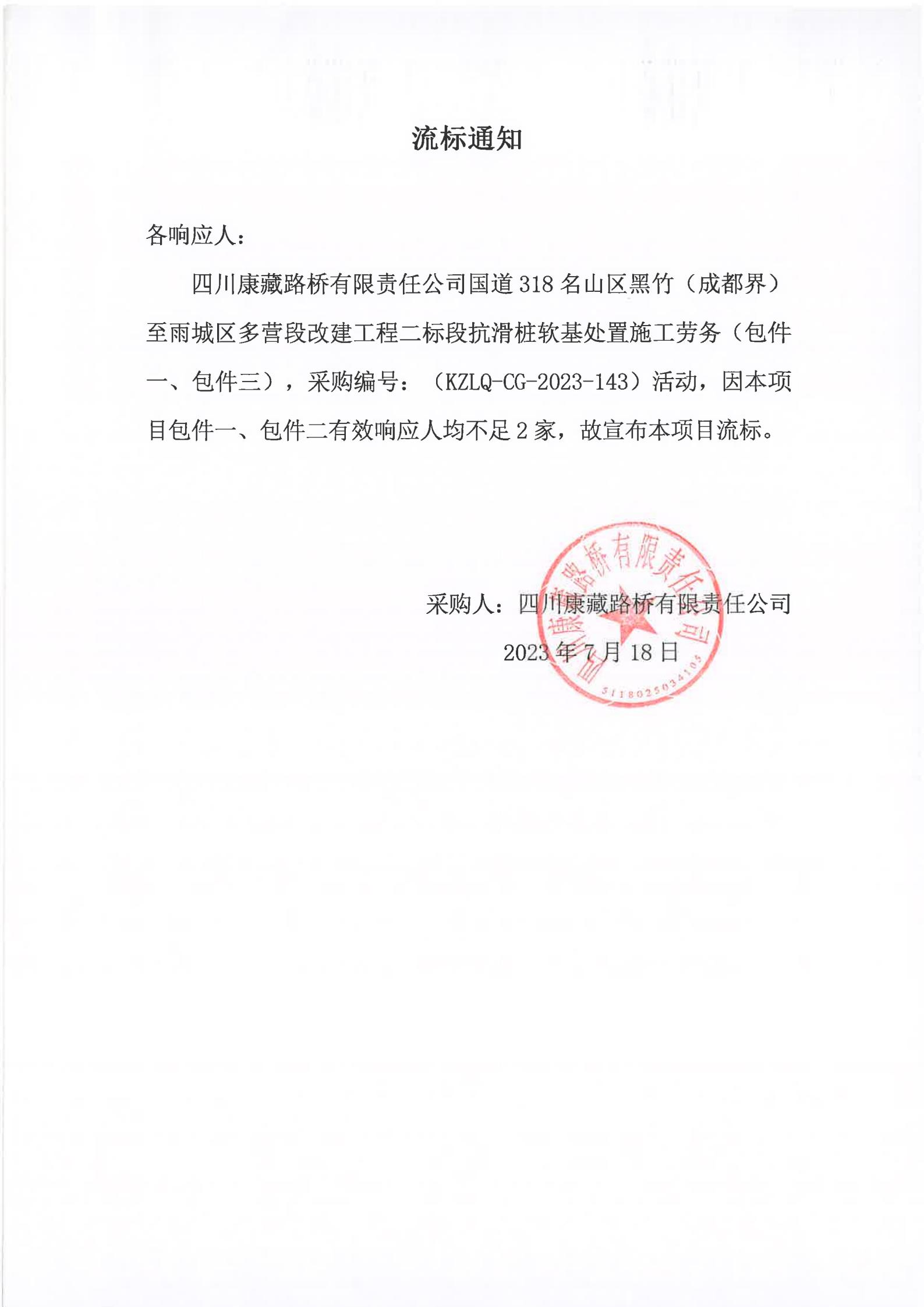 四川康藏路橋有限責任公司國道318名山區(qū)黑竹(成都界)至雨城區(qū)多營段改建工程二標段抗滑樁軟基處置施工勞務(包件一、包件三)流標通知