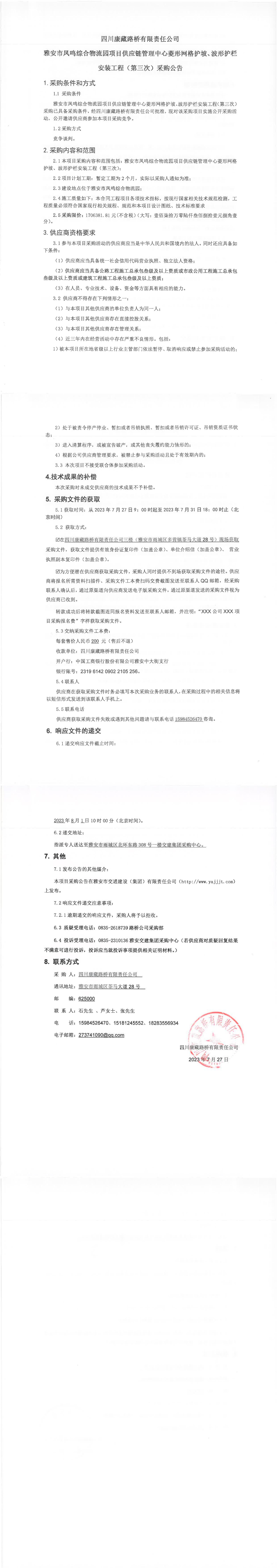 四川康藏路橋有限責任公司雅安市鳳鳴綜合物流園項目供應鏈管理中心菱形網(wǎng)格護坡、波形護欄安裝工程(第三次)采購公告