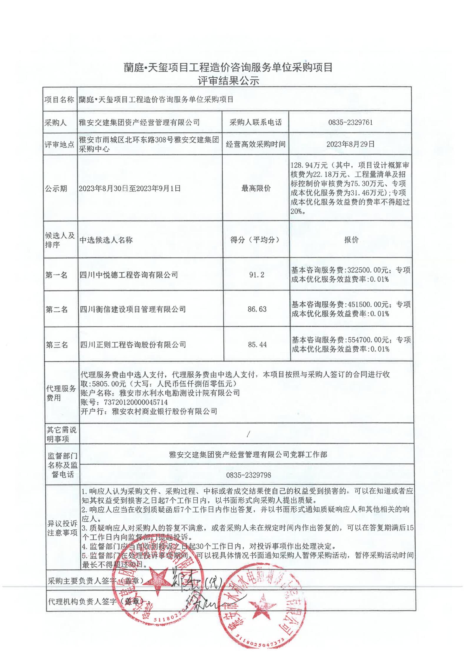 雅安交建集團(tuán)資產(chǎn)經(jīng)營管理有限公司蘭庭·天璽項(xiàng)目工程造價(jià)咨詢服務(wù)單位采購項(xiàng)目評審結(jié)果公示