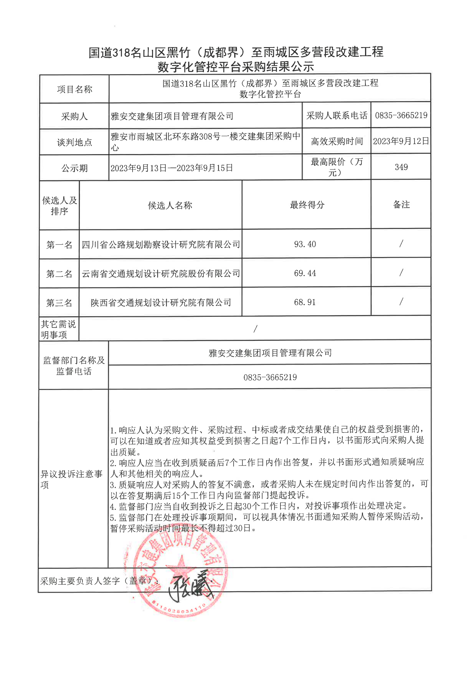 雅安交建集團(tuán)項(xiàng)目管理有限公司國(guó)道318名山區(qū)黑竹(成都界)至雨城區(qū)多營(yíng)段改建工程數(shù)字化管控平臺(tái)采購(gòu)結(jié)果公示