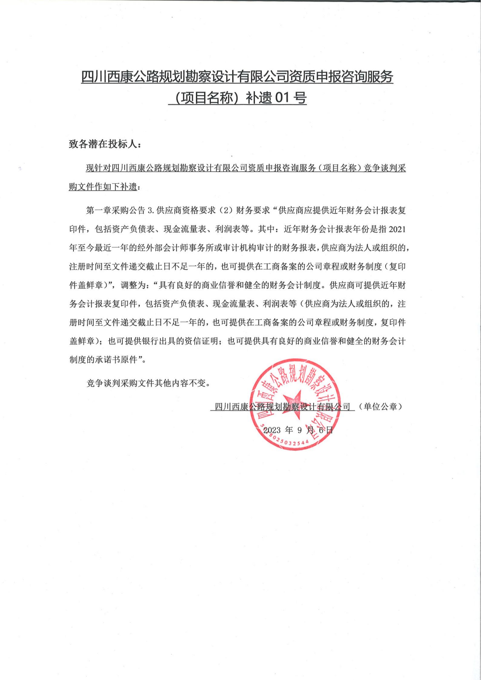 四川西康公路規(guī)劃勘察設(shè)計有限公司資質(zhì)申報咨詢服務(wù)(項目名稱)補遺01號