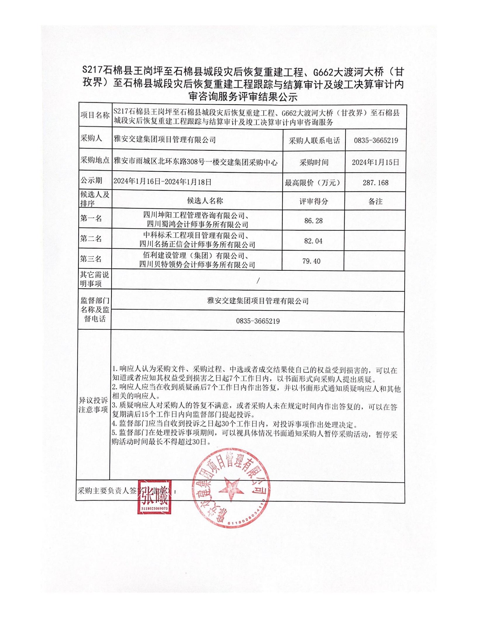雅安交建集團(tuán)項(xiàng)目管理有限公司S217石棉縣王崗坪至石棉縣城段災(zāi)后恢復(fù)重建工程、G662大渡河大橋(甘孜界)至石棉縣城段災(zāi)后恢復(fù)重建工程跟蹤與結(jié)算審計(jì)及竣工決算審計(jì)內(nèi)審咨詢服務(wù)評審結(jié)果公示