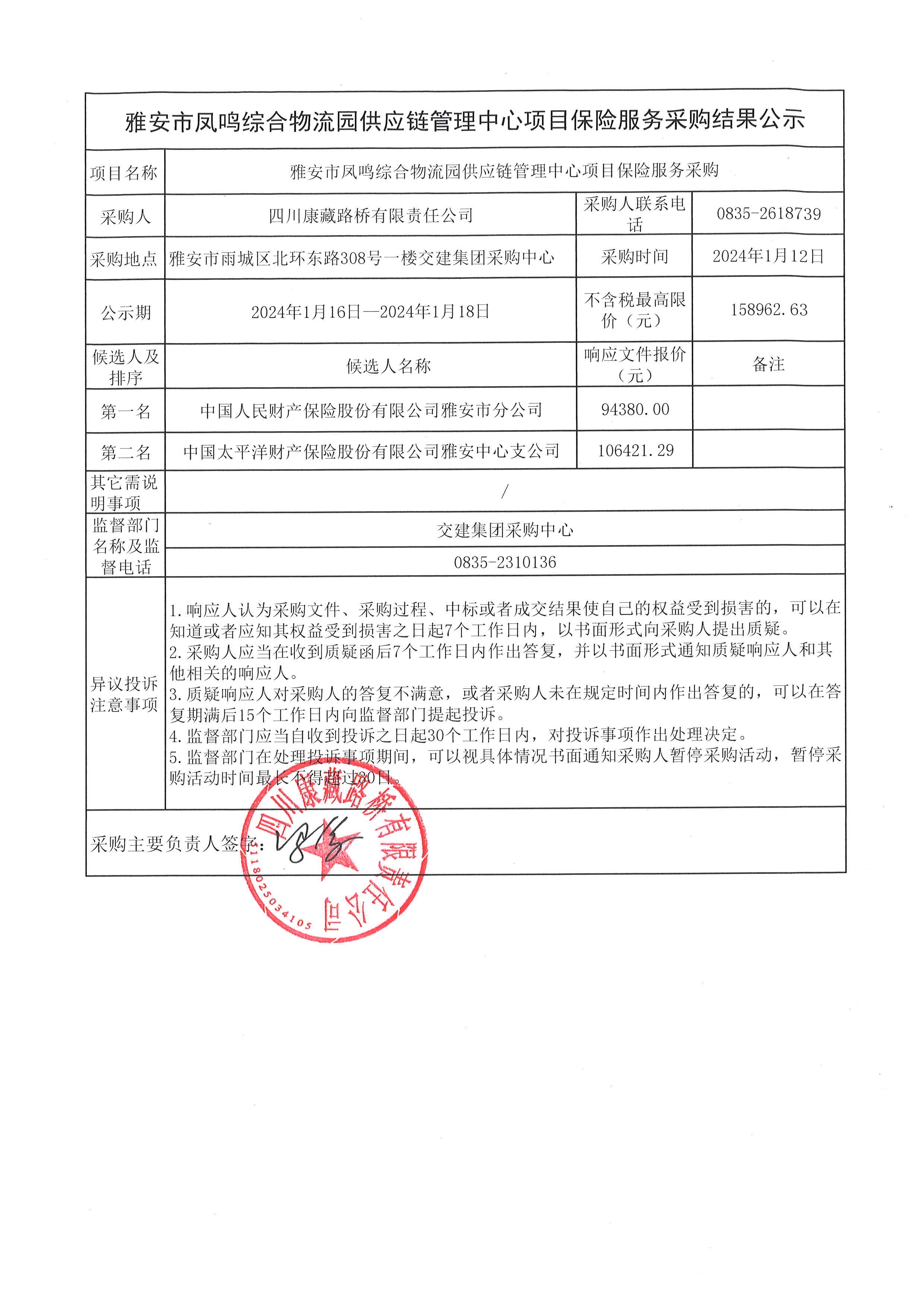 四川康藏路橋有限責任公司雅安市鳳鳴綜合物流園供應鏈管理中心項目保險服務采購結(jié)果公示