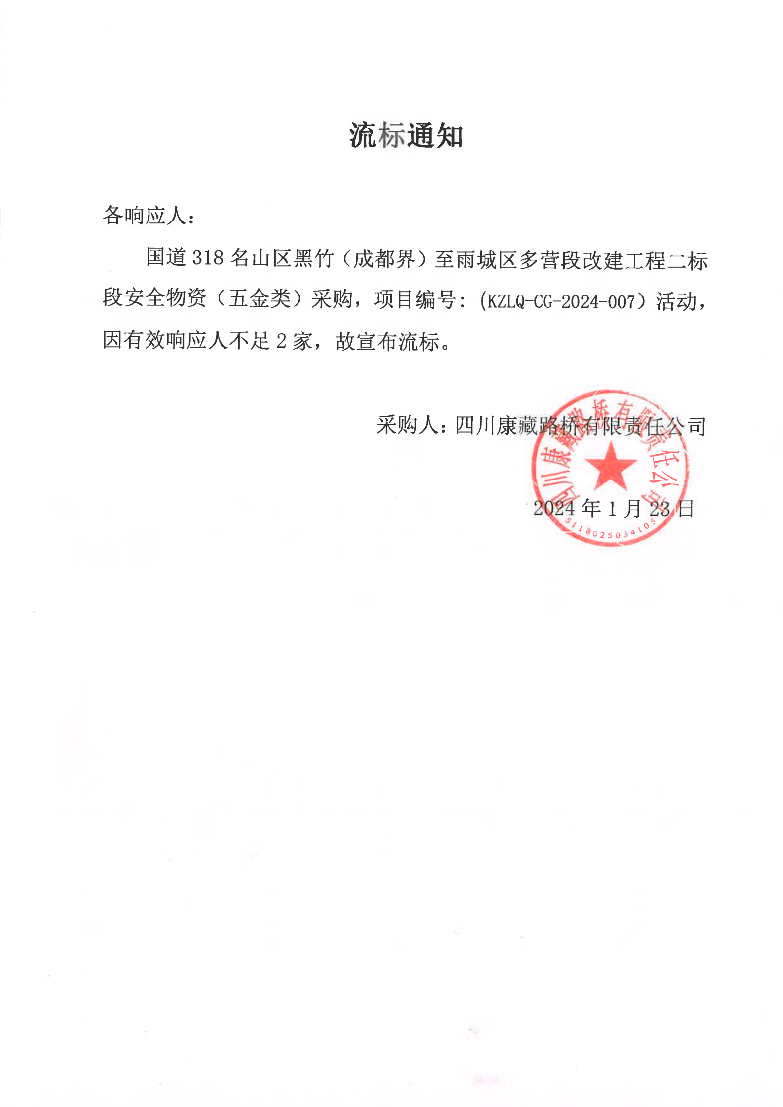 四川康藏路橋有限責(zé)任公司國(guó)道318名山區(qū)黑竹(成都界)至雨城區(qū)多營(yíng)段改建工程二標(biāo)段安全物資(五金類)采購(gòu)流標(biāo)通知
