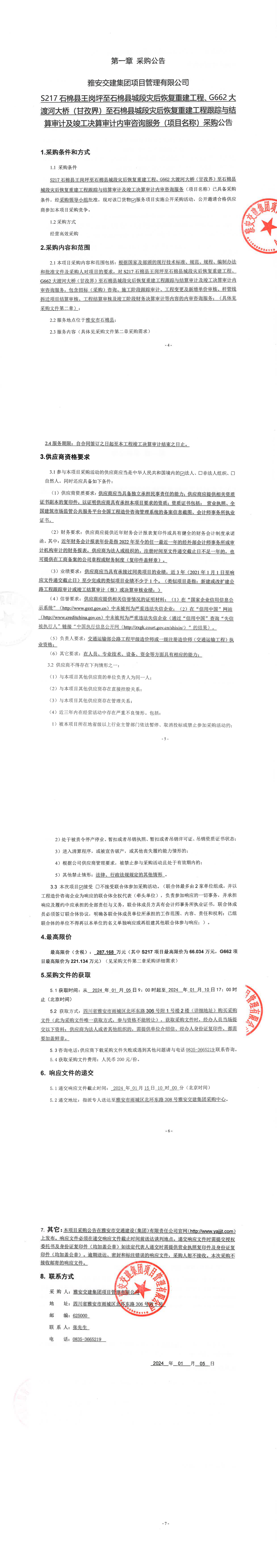 雅安交建集團(tuán)項(xiàng)目管理有限公司S217石棉縣王崗坪至石棉縣城段災(zāi)后恢復(fù)重建工程、G662大渡河大橋(甘孜界)至石棉縣城段災(zāi)后恢復(fù)重建工程跟蹤與結(jié)算審計(jì)及竣工決算審計(jì)內(nèi)審咨詢服務(wù)(項(xiàng)目名稱)采購公告