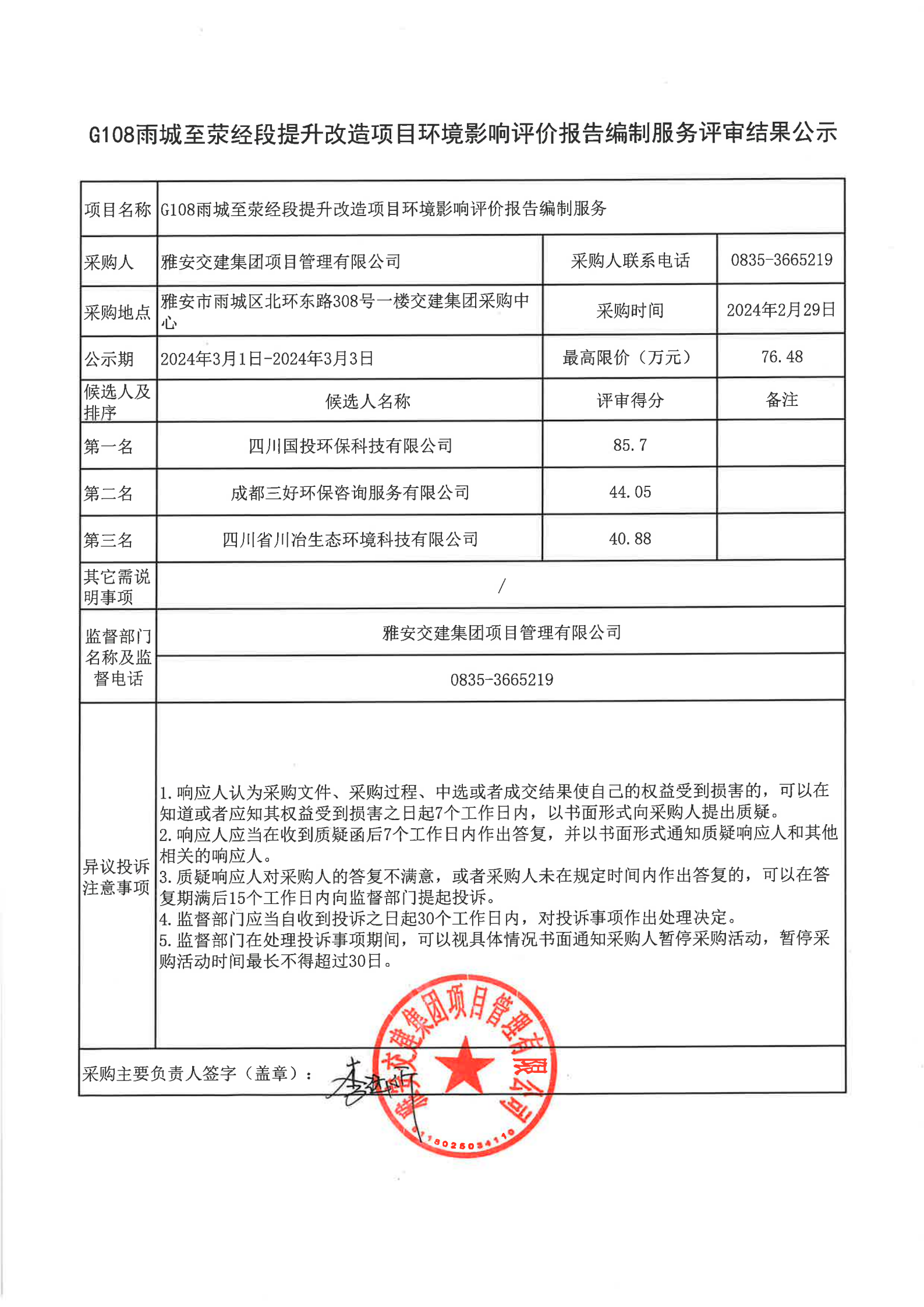 雅安交建集團項目管理有限公司G108雨城至滎經(jīng)段提升改造項目環(huán)境影響評價報告編制服務(wù)評審結(jié)果公示