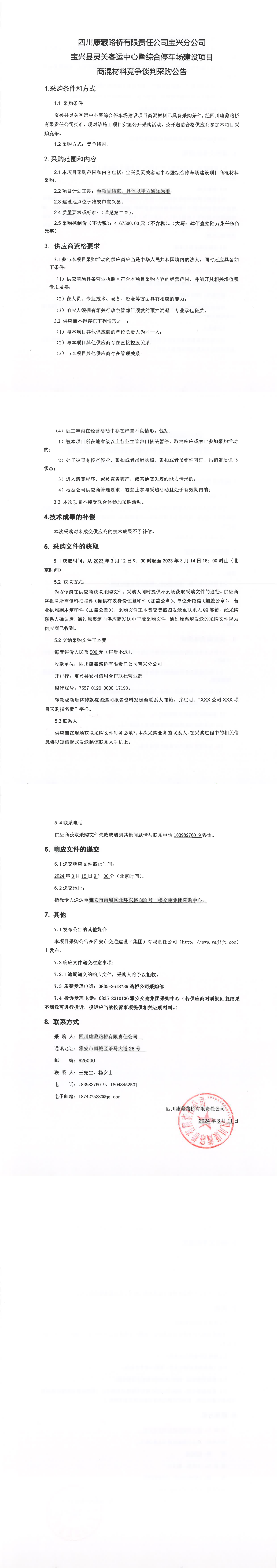 四川康藏路橋有限責(zé)任公司寶興縣靈關(guān)客運(yùn)中心暨綜合停車場(chǎng)建設(shè)項(xiàng)目商混材料競(jìng)爭(zhēng)談判采購(gòu)公告