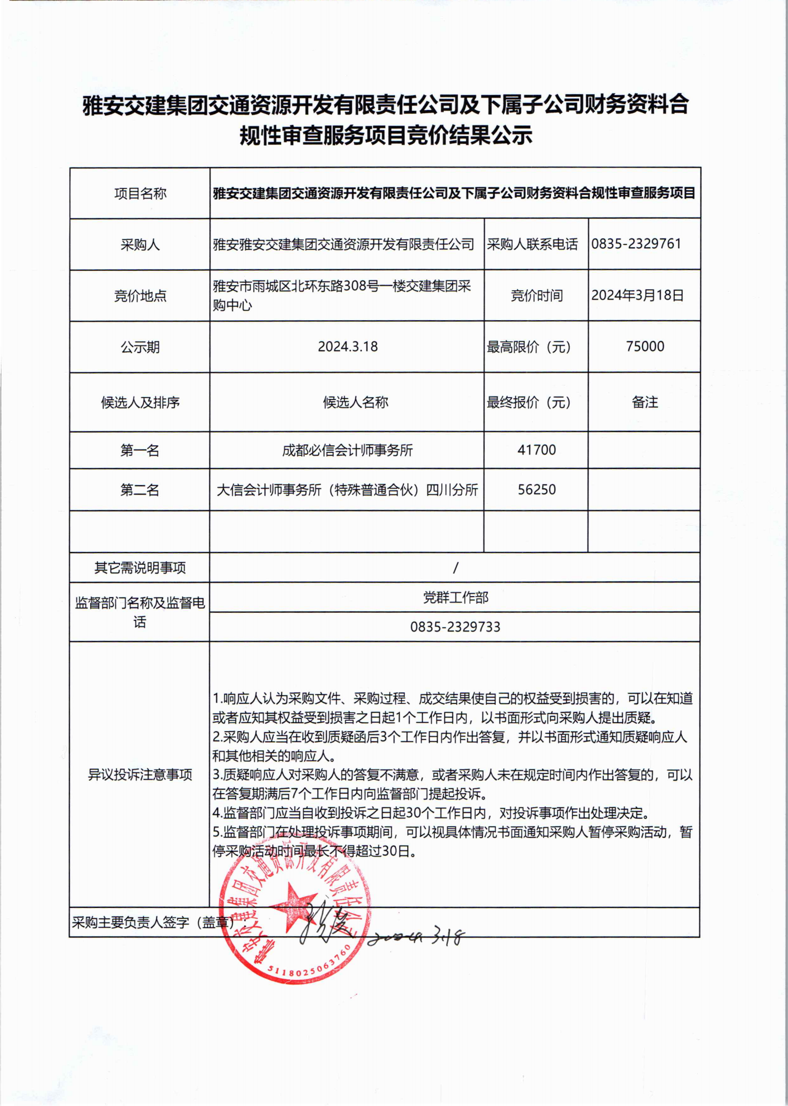 雅安交建集團交通資源開發(fā)有限責任公司及下屬子公司財務資料合規(guī)性審查服務項目競價結果公示