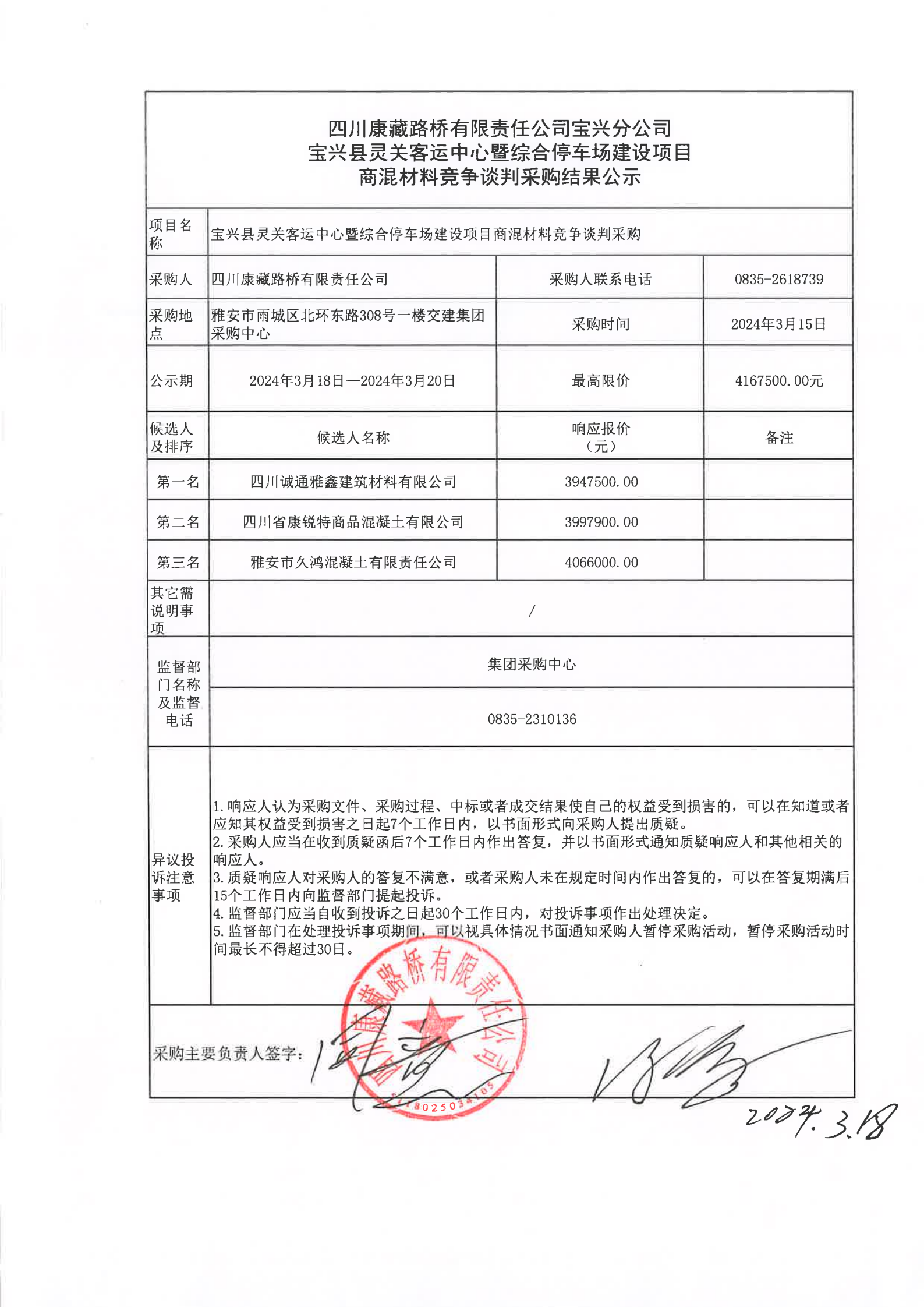 四川康藏路橋有限責(zé)任公司寶興分公司寶興縣靈關(guān)客運(yùn)中心暨綜合停車場建設(shè)項(xiàng)目商混材料競爭談判采購結(jié)果公示