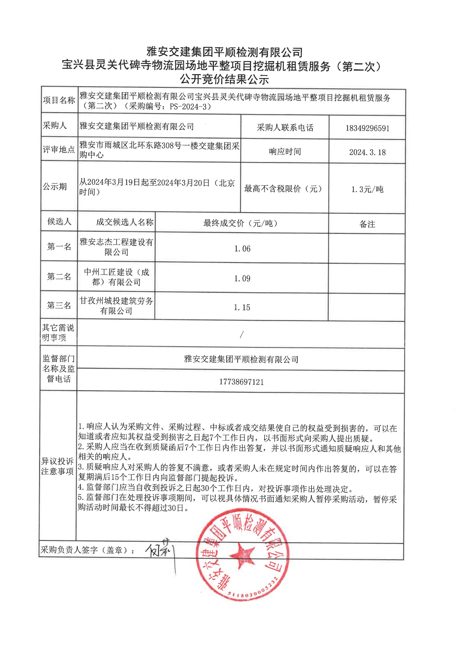 雅安交建集團(tuán)平順檢測有限公司寶興縣靈關(guān)代碑寺物流園場地平整項目挖掘機(jī)租賃服務(wù)(第二次)競價結(jié)果公示