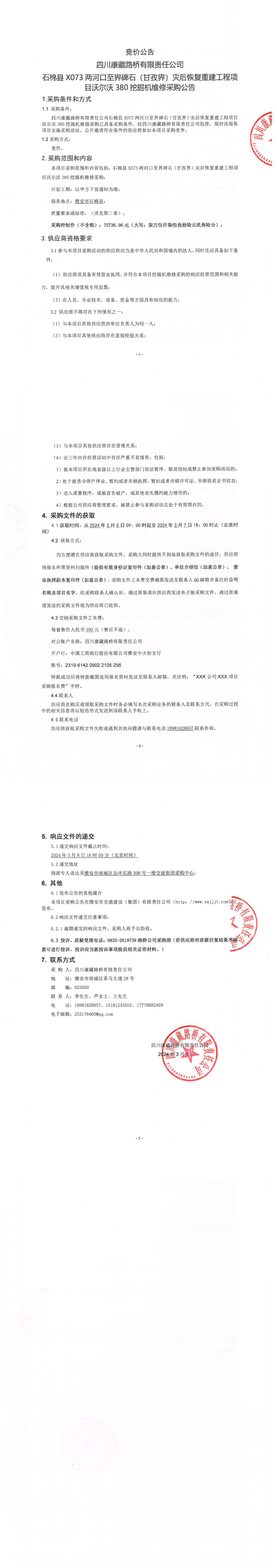 四川康藏路橋有限責(zé)任公司石棉縣X073兩河口至界碑石(甘孜界)災(zāi)后恢復(fù)重建工程項(xiàng)目沃爾沃380挖掘機(jī)維修采購(gòu)公告