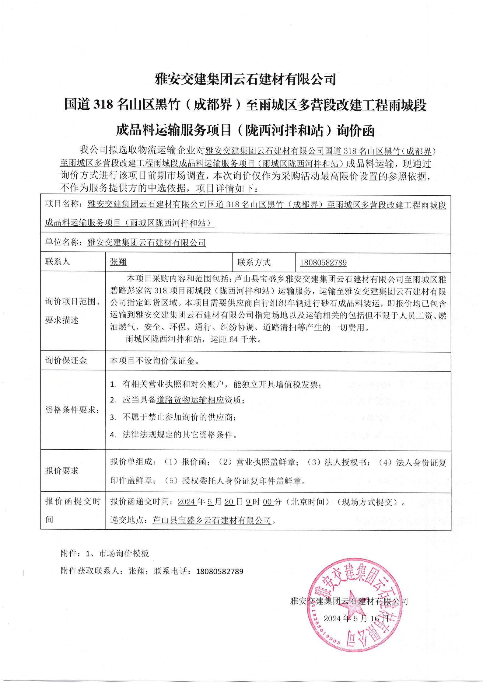 雅安交建集團(tuán)云石建材有限公司國道318名山區(qū)黑竹(成都界)至雨城區(qū)多營段改建工程雨城段成品料運(yùn)輸服務(wù)項(xiàng)目(雨城區(qū)隴西河拌和站)詢價函