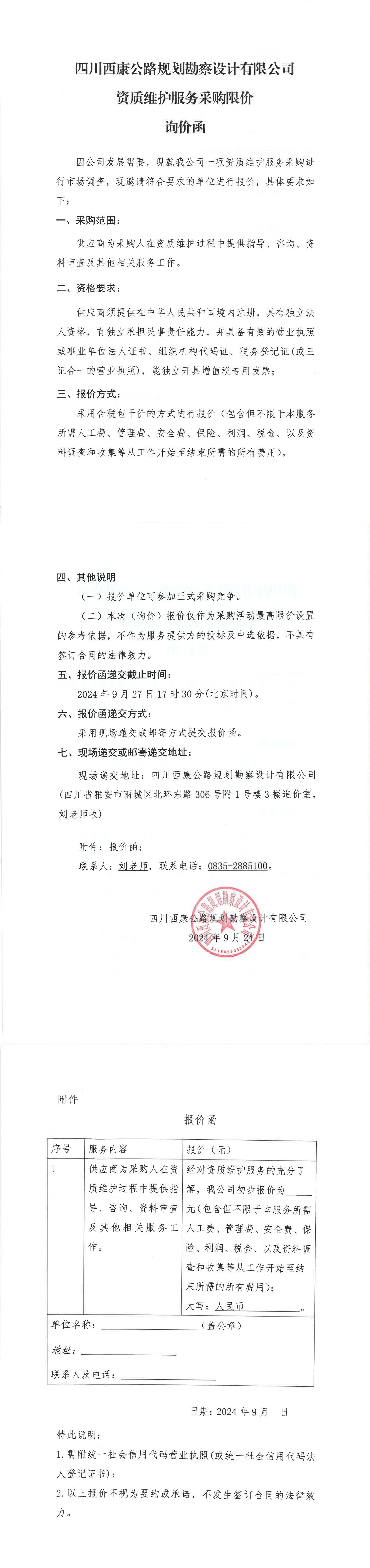 四川西康公路規(guī)劃勘察設(shè)計有限公司資質(zhì)維護(hù)服務(wù)采購限價詢價函