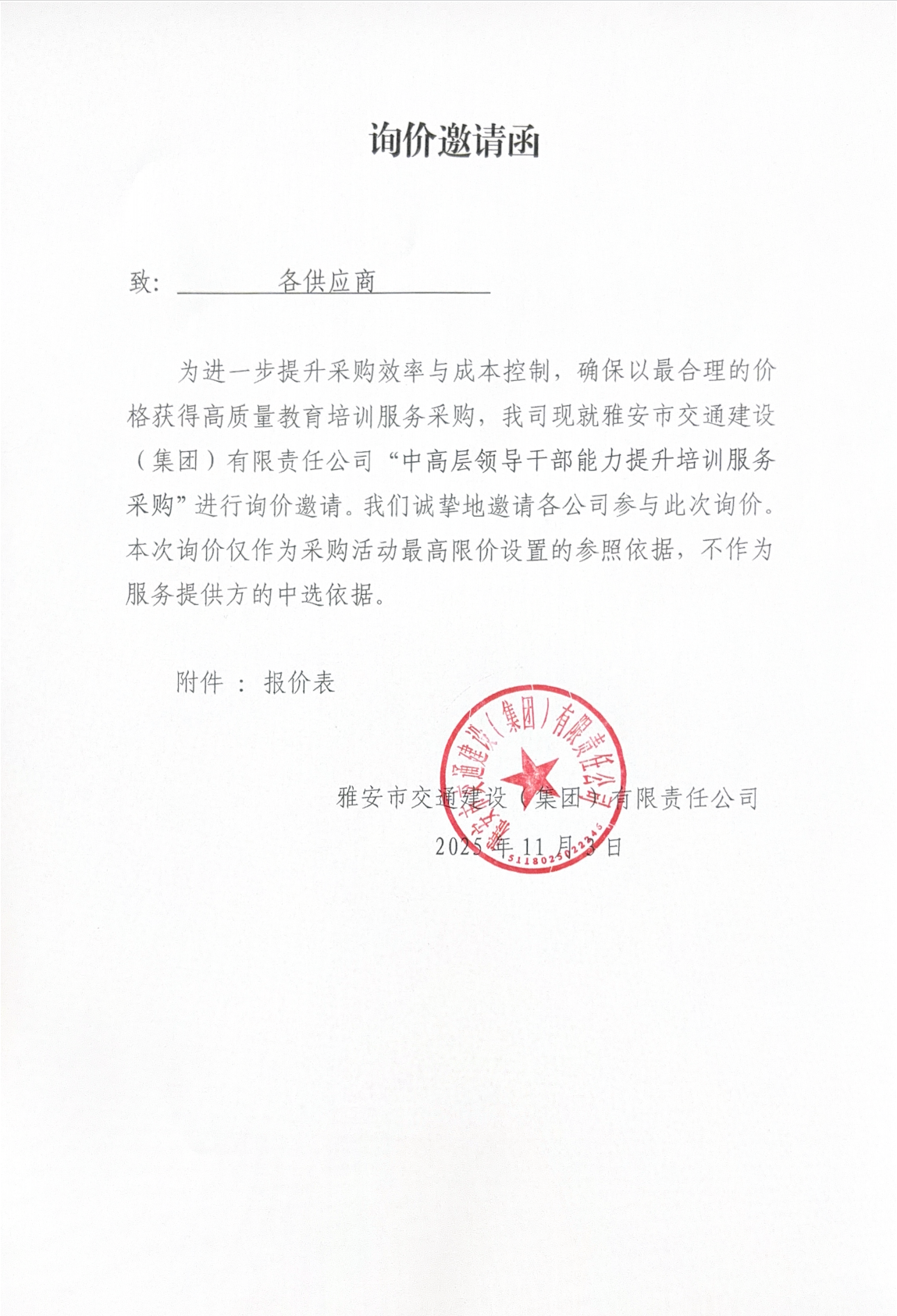 關于雅安交建集團下屬子公司主要負責人經濟責任審計項目限價的詢價函