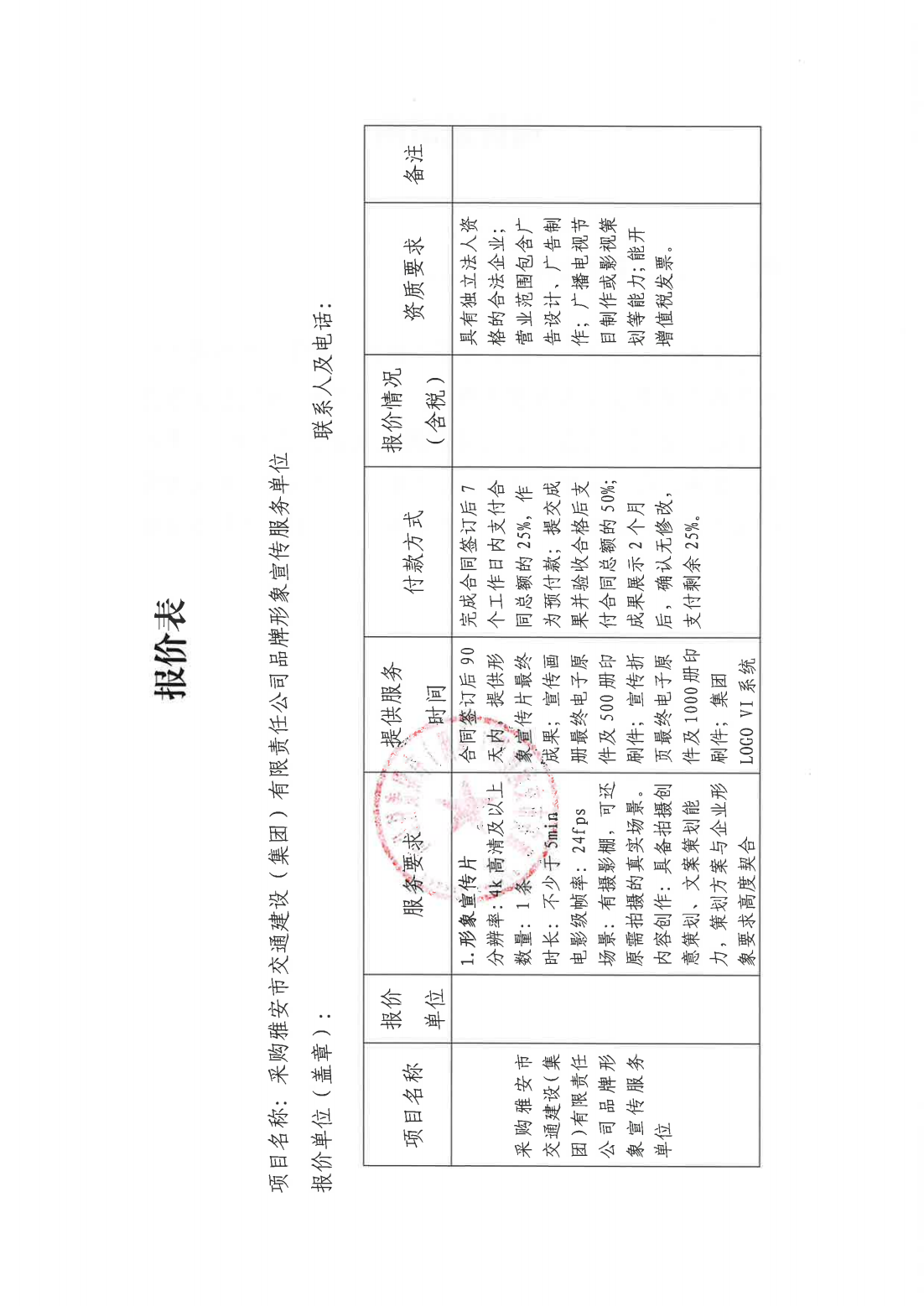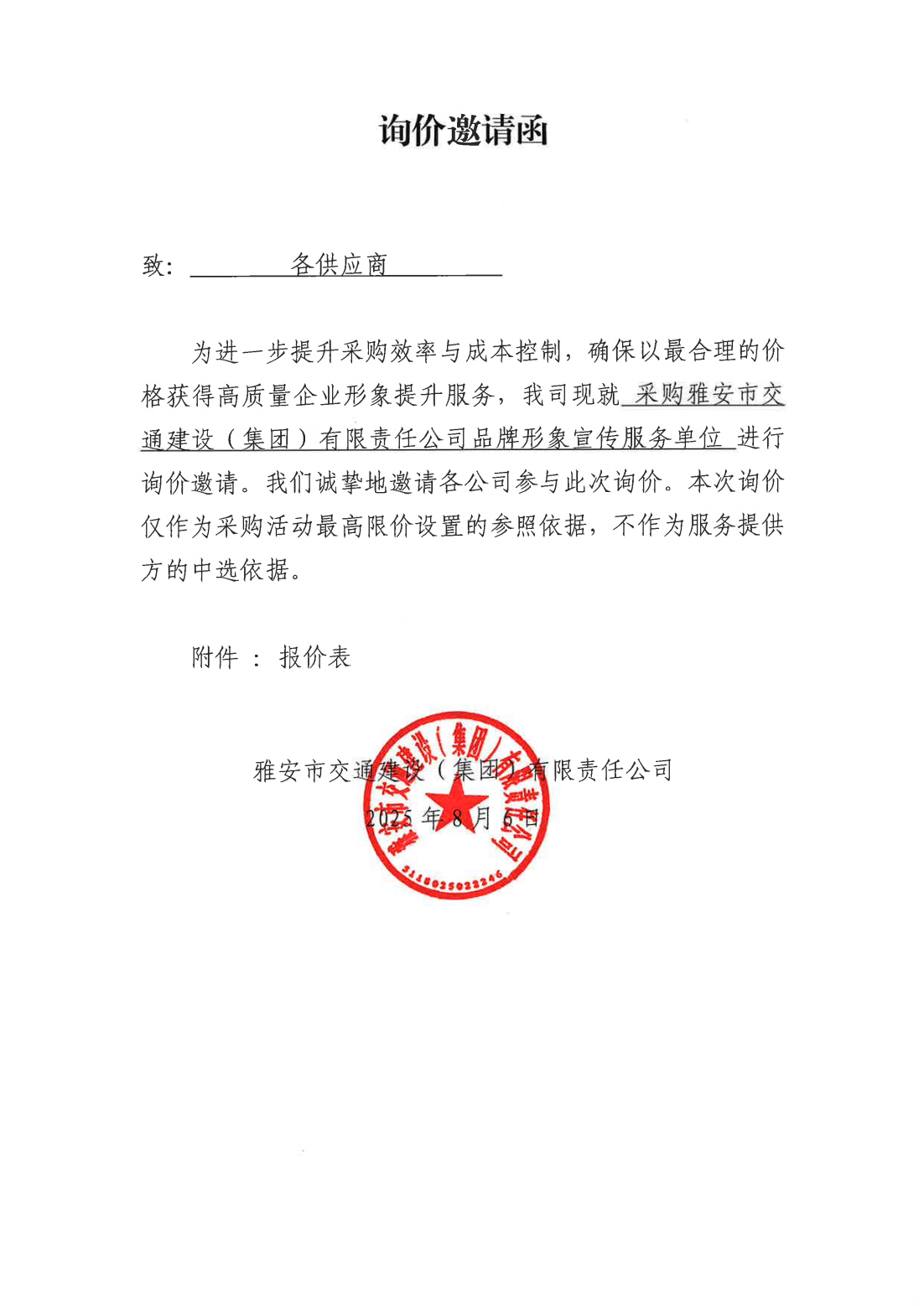 關于采購集團品牌形象宣傳服務單位的詢價函