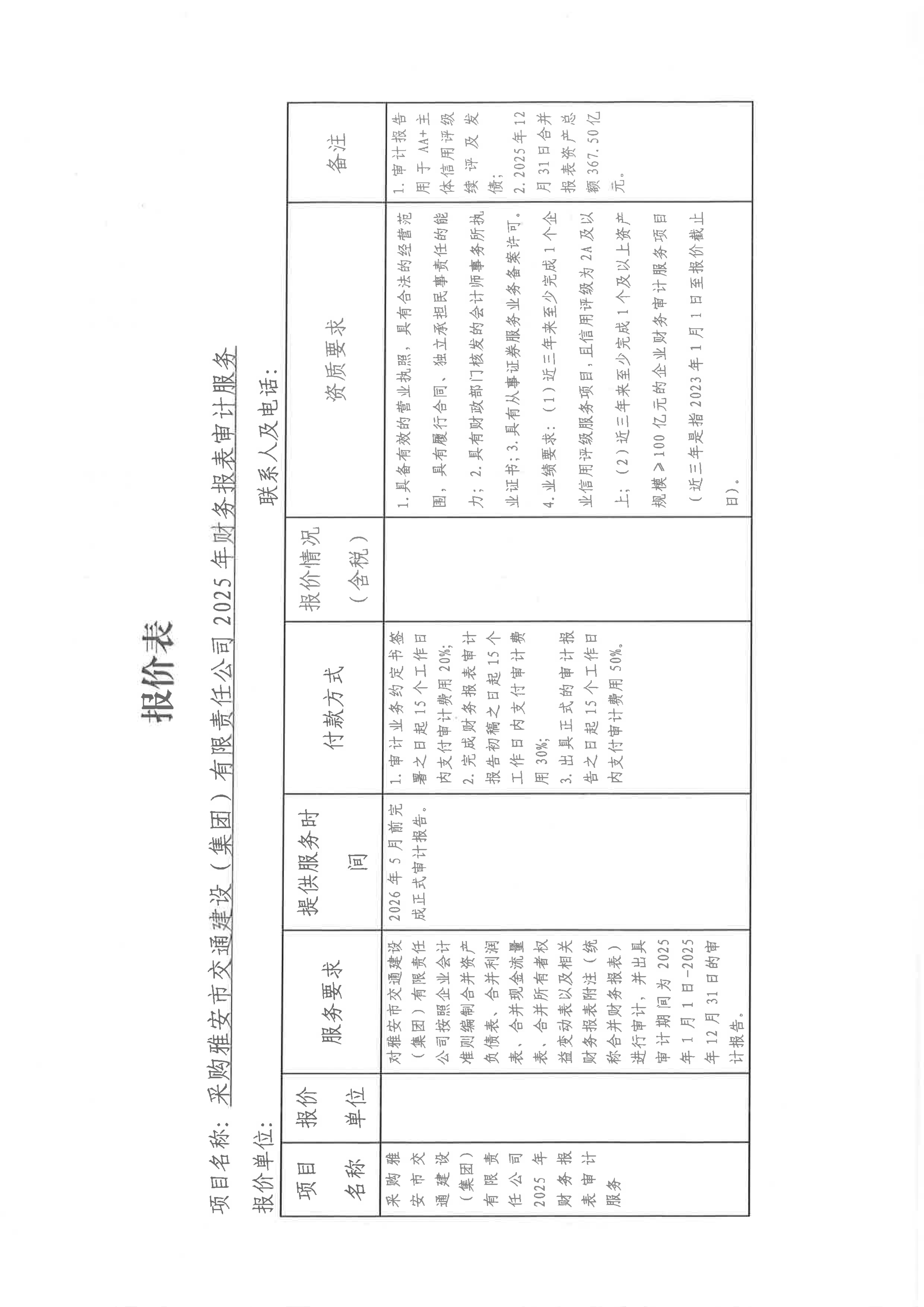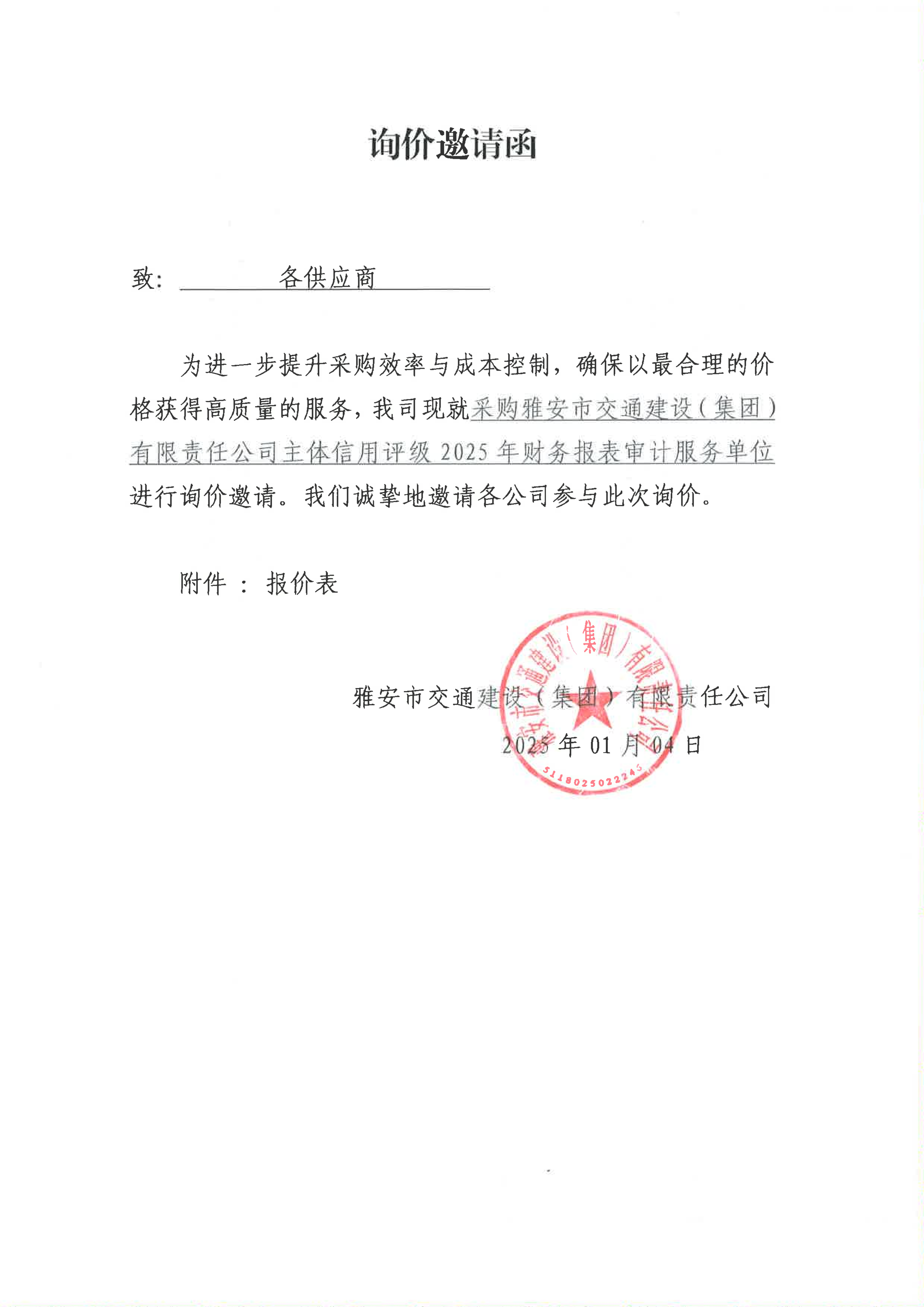 關(guān)于采購雅安市交通建設(shè)(集團)有限責任公司主體信用評級2025年財務報表審計服務限價的詢價函