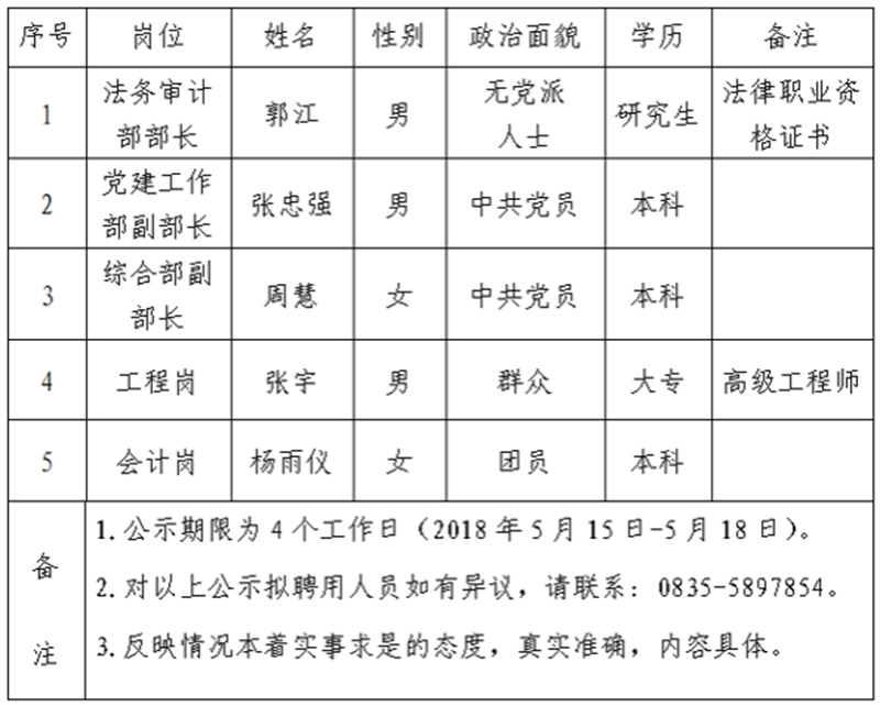 經(jīng)雅安市交通建設(shè)集團(tuán)有限責(zé)任公司研究,對以下5名擬聘用人員予以公示: