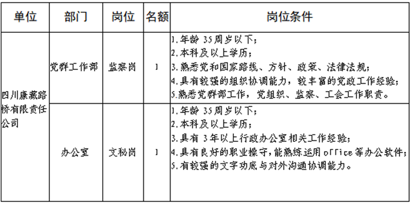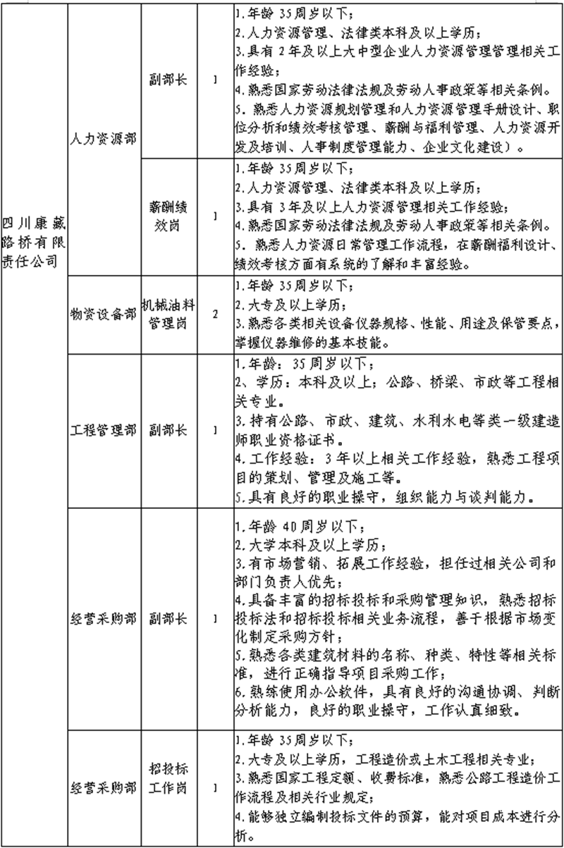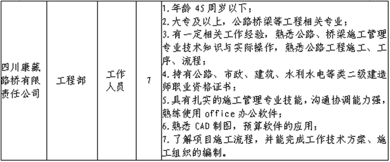 根據(jù)發(fā)展需要,決定面向社會(huì)公開(kāi)招聘雅安市交通建設(shè)(集團(tuán))有限責(zé)任公司(以下簡(jiǎn)稱(chēng)“雅安交建集團(tuán)”)所屬子公司工作人員16名,現(xiàn)將有關(guān)事項(xiàng)公告如下: