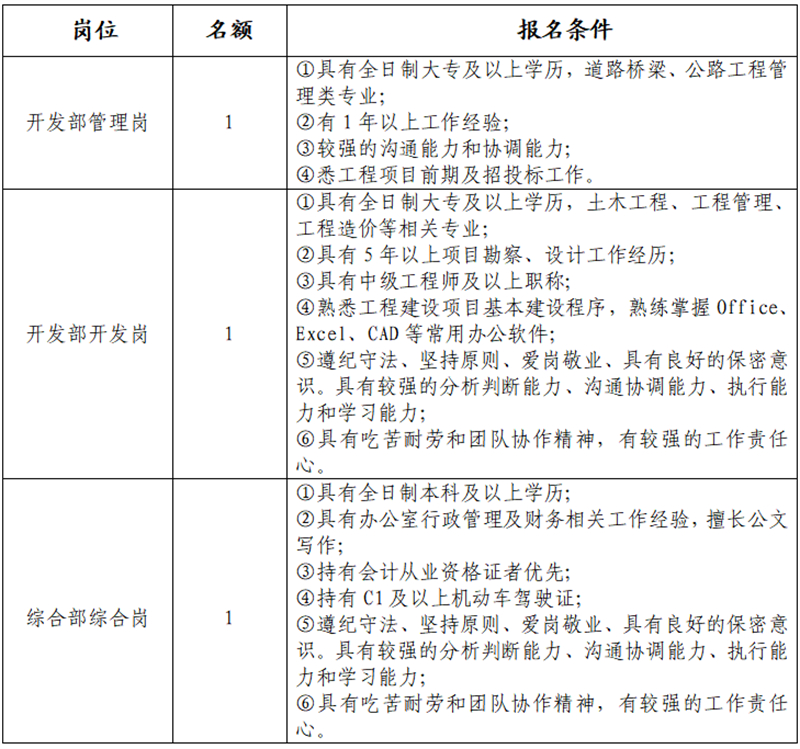 雅安交建集團(tuán)大興交通開發(fā)有限公司是雅安市重點(diǎn)國(guó)有企業(yè)雅安市交建集團(tuán)下屬子公司,主要從事交通基礎(chǔ)設(shè)施及服務(wù)設(shè)施投資、建設(shè)開發(fā);土地整理;房地產(chǎn)開發(fā);建筑材料生產(chǎn)、銷售;旅游開發(fā)等業(yè)務(wù)。根據(jù)公司發(fā)展需要,決定面向社會(huì)公開招聘3名工作人員,現(xiàn)將有關(guān)事項(xiàng)公告如下: