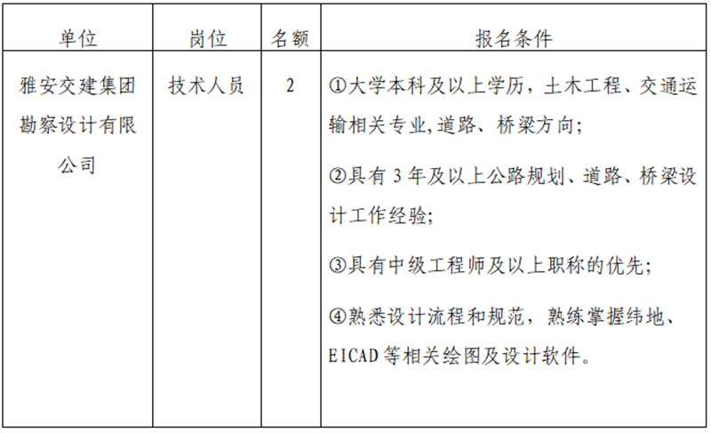 根據(jù)發(fā)展需要,決定面向社會(huì)公開(kāi)招聘雅安市交通建設(shè)(集團(tuán))有限責(zé)任公司(以下簡(jiǎn)稱“雅安交建集團(tuán)”)所屬子公司工作人員2名,現(xiàn)將有關(guān)事項(xiàng)公告如下: