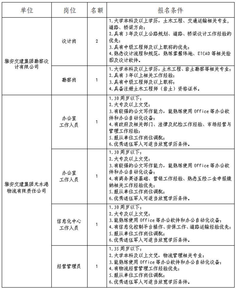 根據(jù)發(fā)展需要,決定面向社會公開招聘雅安市交通建設(集團)有限責任公司(以下簡稱“雅安交建集團”)所屬子公司工作人員7名,現(xiàn)將有關事項公告如下: