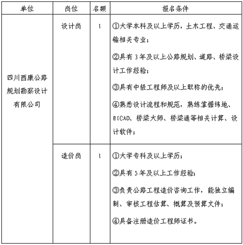 根據(jù)發(fā)展需要,決定面向社會(huì)公開招聘雅安市交通建設(shè)(集團(tuán))有限責(zé)任公司(以下簡(jiǎn)稱“雅安交建集團(tuán)”)所屬子公司工作人員2名,現(xiàn)將有關(guān)事項(xiàng)公告如下: