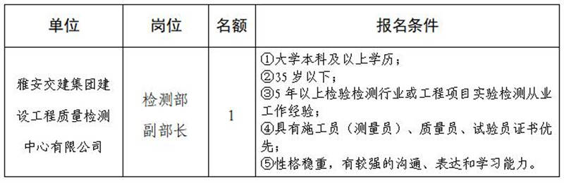 根據(jù)發(fā)展需要,決定面向社會(huì)公開招聘雅安市交通建設(shè)(集團(tuán))有限責(zé)任公司(以下簡(jiǎn)稱“雅安交建集團(tuán)”)所屬子公司中層干部1名,現(xiàn)將有關(guān)事項(xiàng)公告如下: