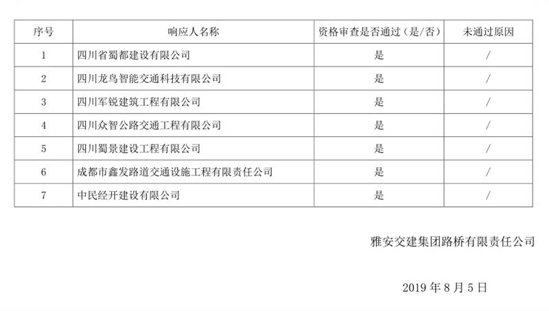 雅安交建集團路橋有限責任公司公路安全設(shè)施施工企業(yè)入庫比選結(jié)果