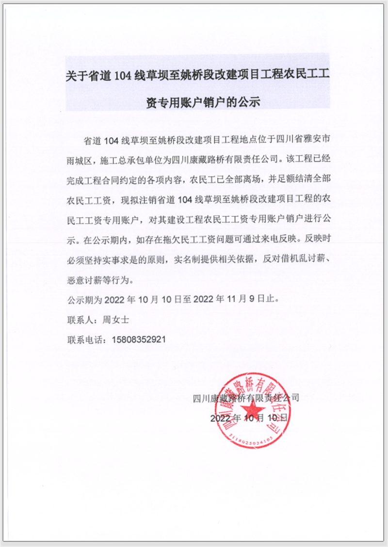 關于省道104線草壩至姚橋段改建項目工程農(nóng)民工工資專用賬戶銷戶的公告