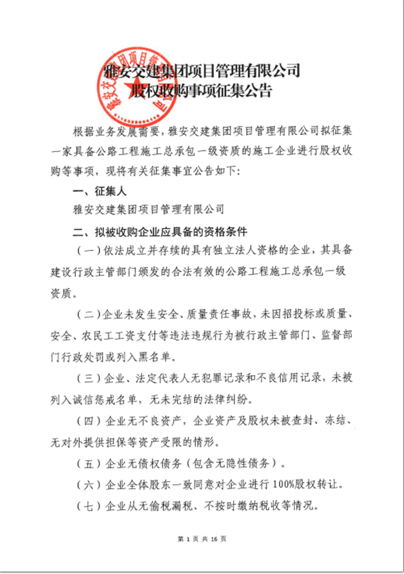 交建集團(tuán)項目公司股權(quán)并購事項征集公告