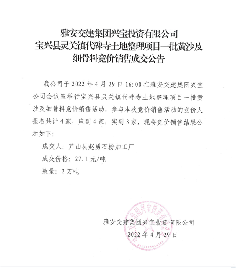 興寶公司競(jìng)價(jià)銷售成交公告