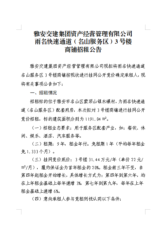 雅安交建集團(tuán)資產(chǎn)經(jīng)營(yíng)管理有限公司 雨名快速通道(名山服務(wù)區(qū))3號(hào)樓商鋪招租公告
