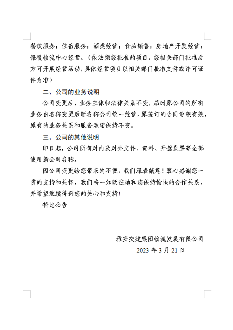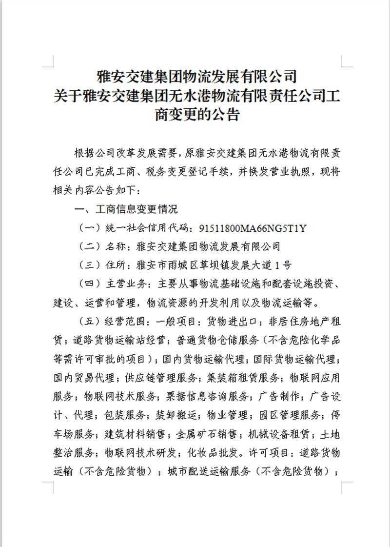 雅安交建集團物流發(fā)展有限公司關(guān)于雅安交建集團無水港物流有限責(zé)任公司工商變更的公告