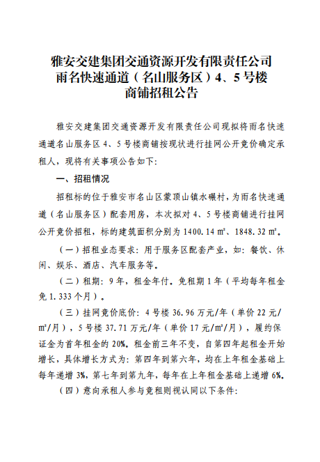 雅安交建集團(tuán)交通資源開(kāi)發(fā)有限責(zé)任公司雨名快速通道(名山服務(wù)區(qū))4、5號(hào)樓招租公告附件