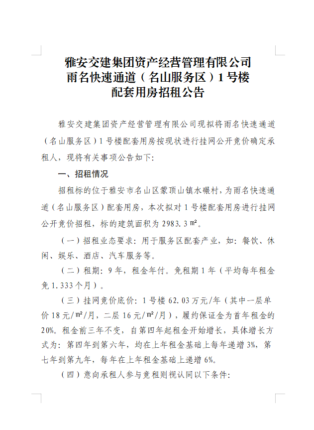雅安交建集團(tuán)資產(chǎn)經(jīng)營管理有限公司雨名快速通道(名山服務(wù)區(qū))1號樓配套用房招租公告