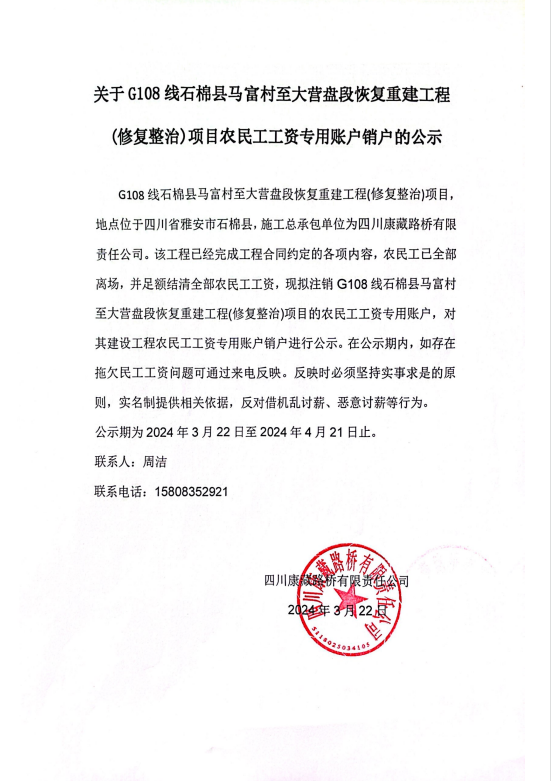 關(guān)于G108線石棉縣馬富村至大營盤段恢復重建工程(修復整治)項目農(nóng)民工工資專用賬戶銷戶的公示
