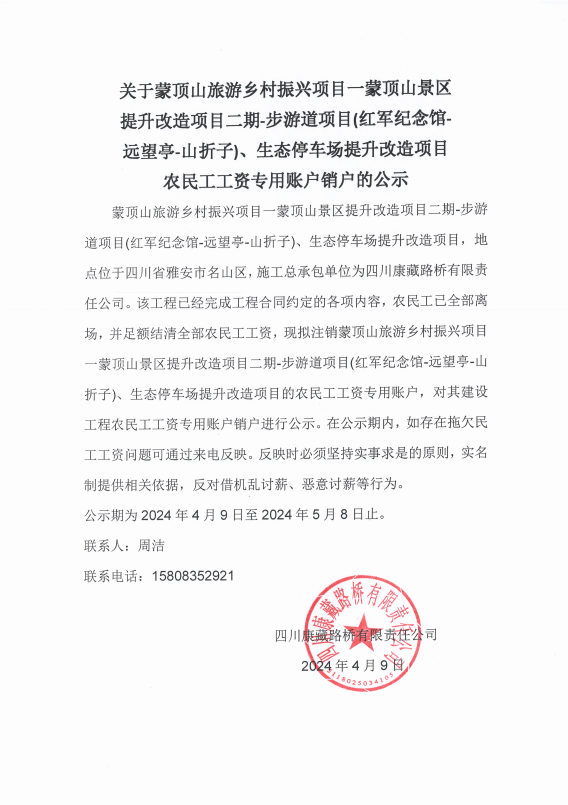 關(guān)于蒙頂山旅游鄉(xiāng)村振興項(xiàng)目一蒙頂山景區(qū)提升改造項(xiàng)目二期-步游道項(xiàng)目(紅軍紀(jì)念館遠(yuǎn)望亭-山折子)、生態(tài)停車場提升改造項(xiàng)目農(nóng)民工工資專用賬戶銷戶的公示