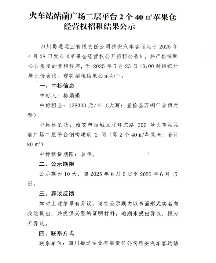 火車站站前廣場(chǎng)二層平臺(tái)2個(gè)40㎡蘋果倉(cāng)經(jīng)營(yíng)權(quán)招租結(jié)果公示