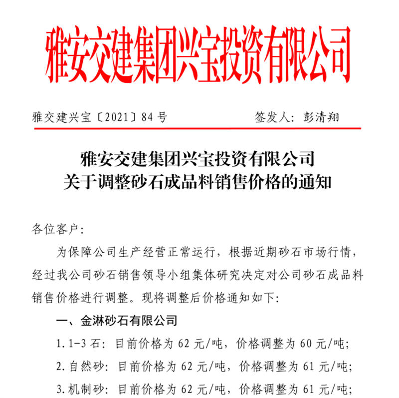 雅安交建集團(tuán)丹石公司關(guān)于調(diào)整砂石成品骨料銷售價(jià)格的通知(2021.12.9)