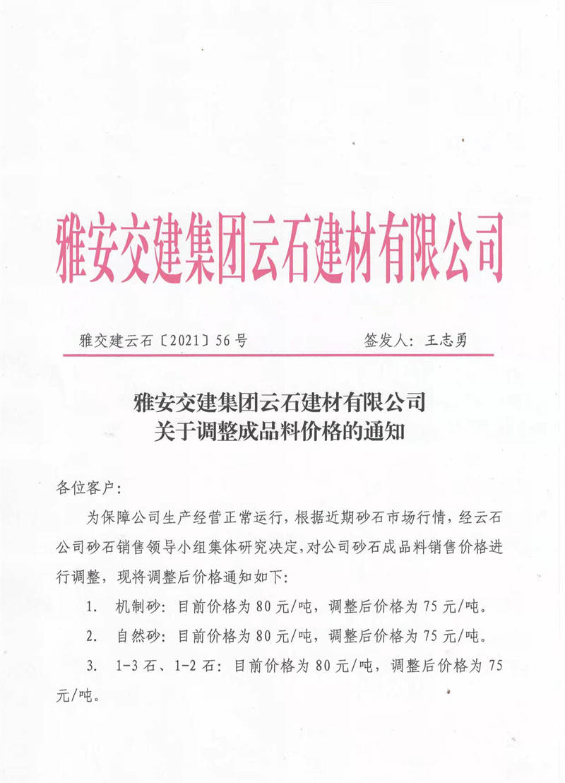 雅安交建集團(tuán)云石公司關(guān)于調(diào)整成品料銷(xiāo)售價(jià)格的通知(2021.11.4)
