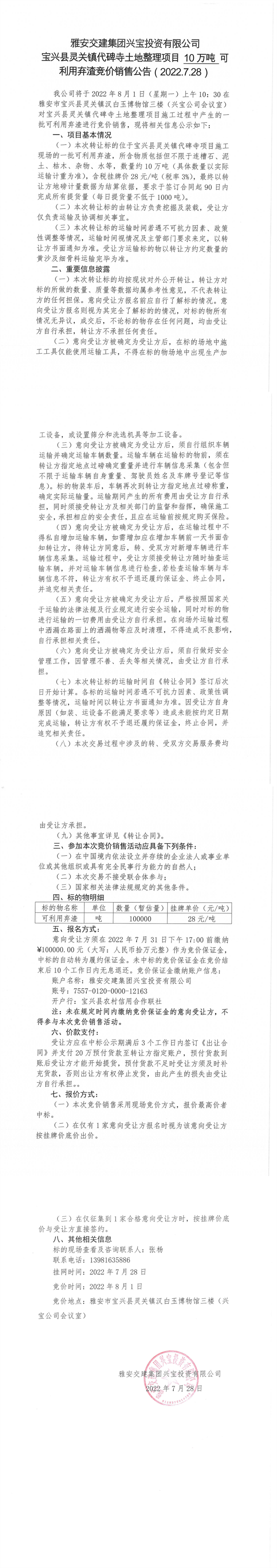 雅安交建集團(tuán)興寶投資有限公司靈關(guān)鎮(zhèn)代碑寺土地整理項目10萬噸可利用棄渣競價銷售公告(2022.7.28)