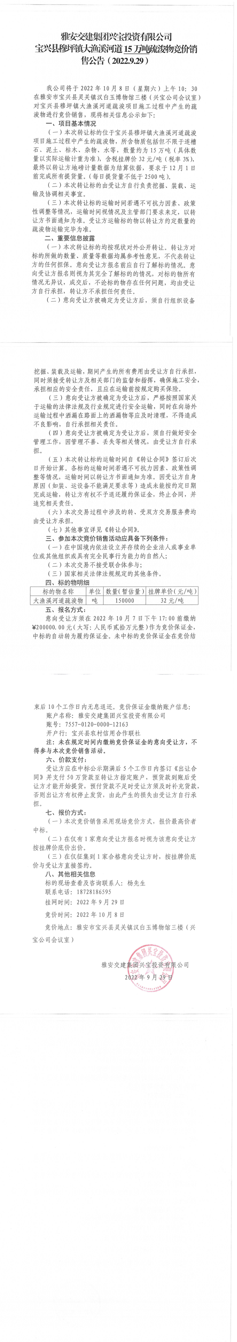 雅安交建集團興寶投資有限公司寶興縣穆坪鎮(zhèn)大漁溪河道15萬噸疏浚物競價銷售公告(2022.9.29)