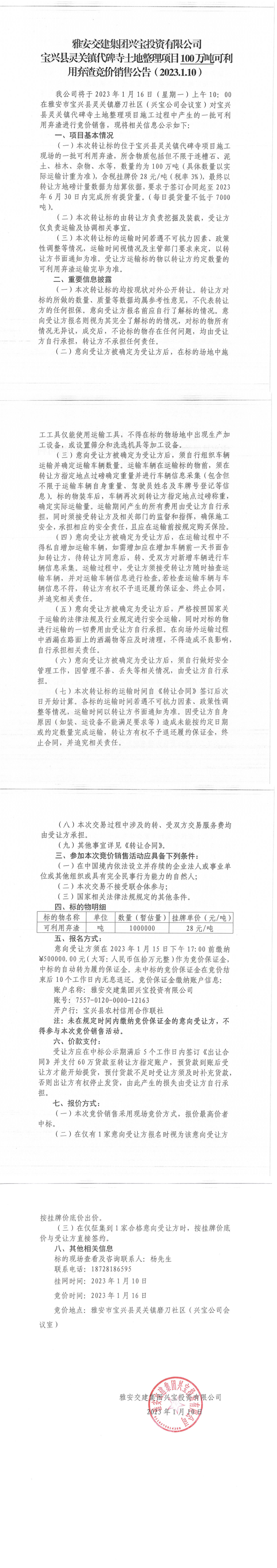 雅安交建集團(tuán)興寶投資有限公司靈關(guān)鎮(zhèn)代碑寺土地整理項(xiàng)目100萬(wàn)噸可利用棄渣競(jìng)價(jià)銷(xiāo)售公告(2023.1.10)