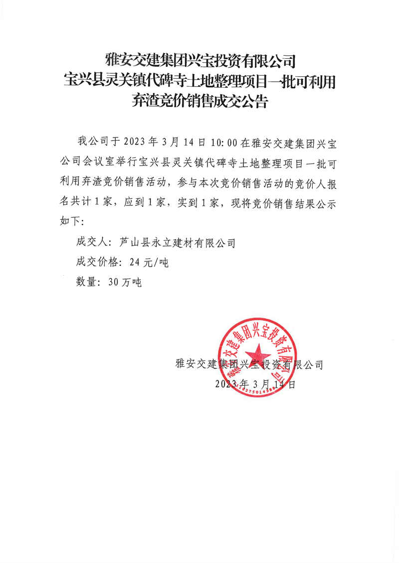 雅安交建集團興寶投資有限公司靈關鎮(zhèn)代碑寺土地整理項目30萬噸可利用棄渣競價銷售成交公告(2023.3.20)