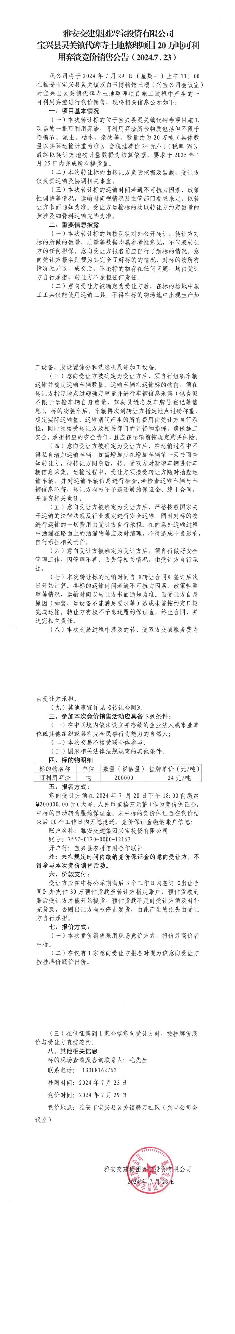 雅安交建集團(tuán)興寶投資有限公司靈關(guān)鎮(zhèn)代碑寺土地整理項(xiàng)目20萬(wàn)噸可利用棄渣競(jìng)價(jià)銷(xiāo)售公告(2024.7.23)