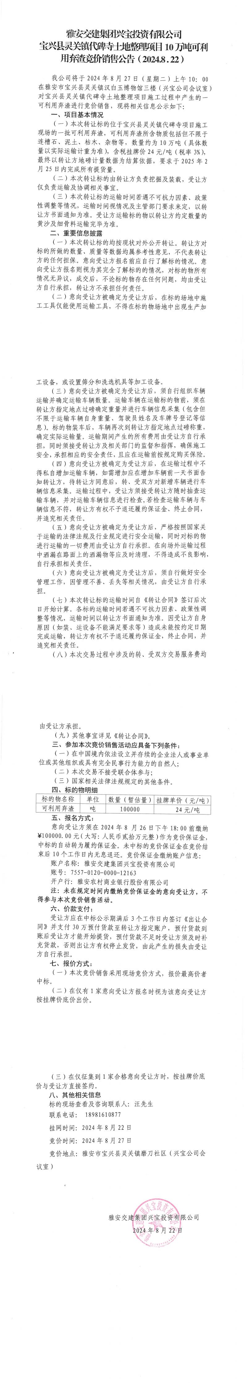 雅安交建集團興寶投資有限公司寶興縣靈關(guān)鎮(zhèn)代碑寺土地整理項目10萬噸可利用棄渣競價銷售公告(2024-8-22)_0