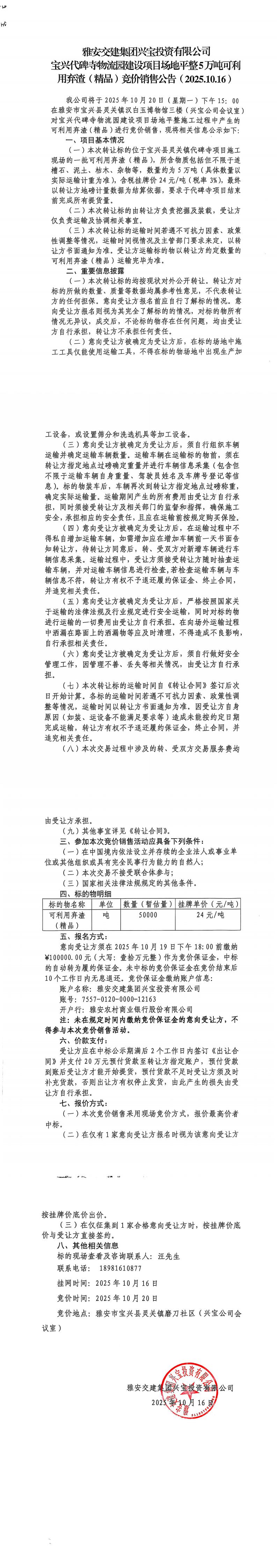 雅安交建集團(tuán)興寶投資有限公司寶興代碑寺物流園建設(shè)項目場地平整5萬噸可利用棄渣(精品)競價銷售公告(2025.10.16)