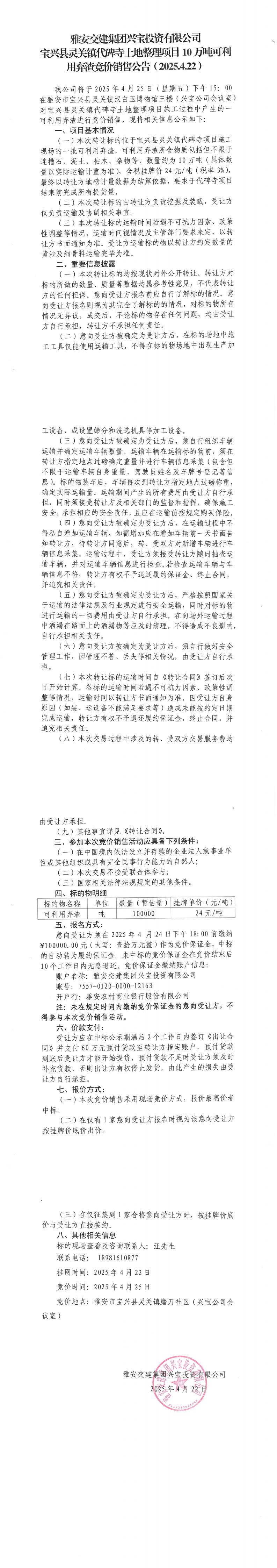 雅安交建集團(tuán)興寶投資有限公司寶興縣靈關(guān)鎮(zhèn)代碑寺土地整理項(xiàng)目10萬噸可利用棄渣競(jìng)價(jià)銷售公告
